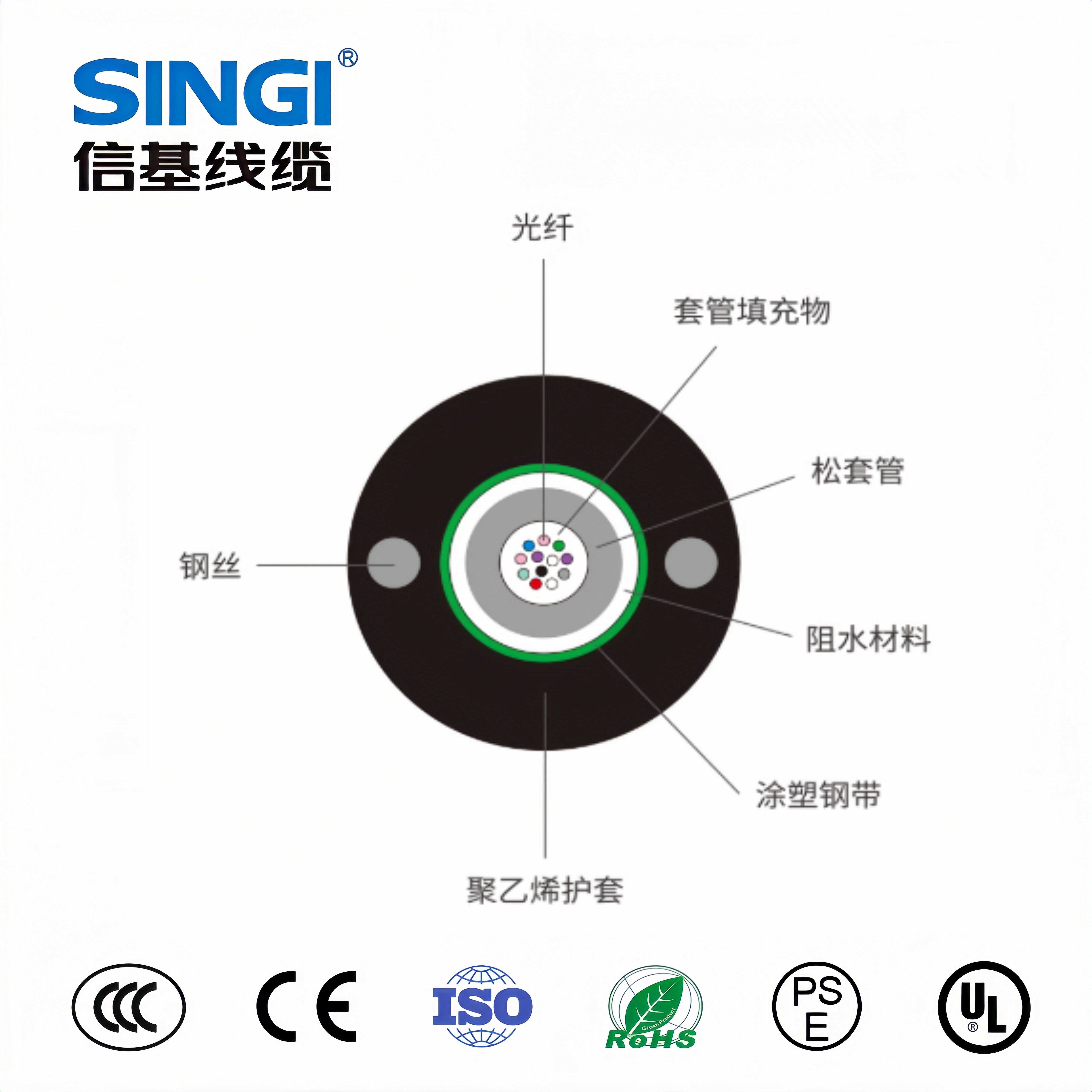 GYXTW光缆的结构是将250um光纤套入高模量材料制成的松套管中,松套管内填充防水化合物。松套管外用一层双面涂塑钢带(PSP)纵包,钢带和松套管之间加阻水材料以保证光缆的紧凑和纵向渗水,两侧放置两根平行钢丝后挤制聚乙烯护套成缆。